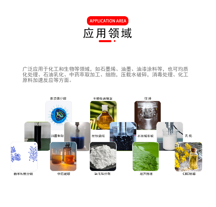 超声波液体处理设备是利用超声波的空化效应,即当超声波在液体中传播时,由于液体微粒的剧烈振动,会在液体内部产生小空穴。这些小空穴迅速胀大和闭合,导致液体微粒之间发生猛烈的撞击,从而产生几千到上万个大气压的压强。这种微粒间剧烈的相互作用产生的微射流会使物料发生颗粒细化、细胞破碎、解团聚、相互融合等一系列反应,从而起到很好的分散、均质、搅拌、乳化、提取等作用。